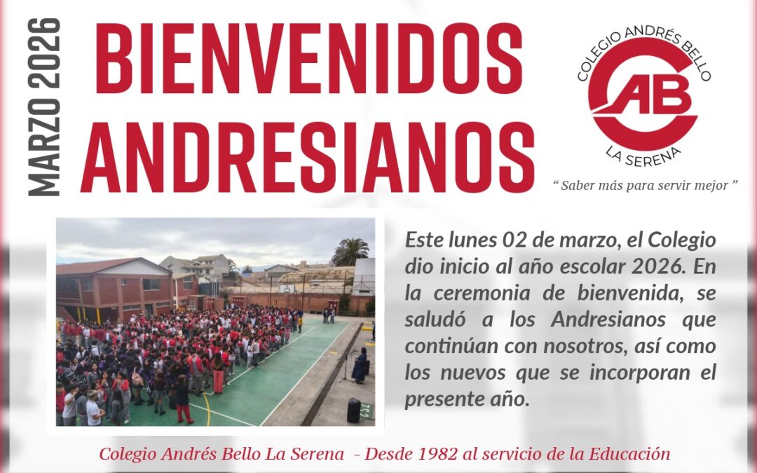 El presente lunes 02 de marzo, el Colegio dio inicio al año escolar 2026. En la ceremonia de bienvenida, se saludó a los Andresianos que continúan con nosotros el presente año, así como los nuevos que se incorporan. En particular se presentó al nuevo primero básico junto al nuevo al I° medio C. Se destacó la labor del Centro de Estudiantes para el presente año y a los IV° medios A y B, quienes cumplen su última etapa del proceso escolar. Se saludó también, a los docentes y funcionarios que se suman a la noble tarea educativa de nuestro establecimiento. Reiteramos los mejores deseos para este nuevo año escolar que comienza.