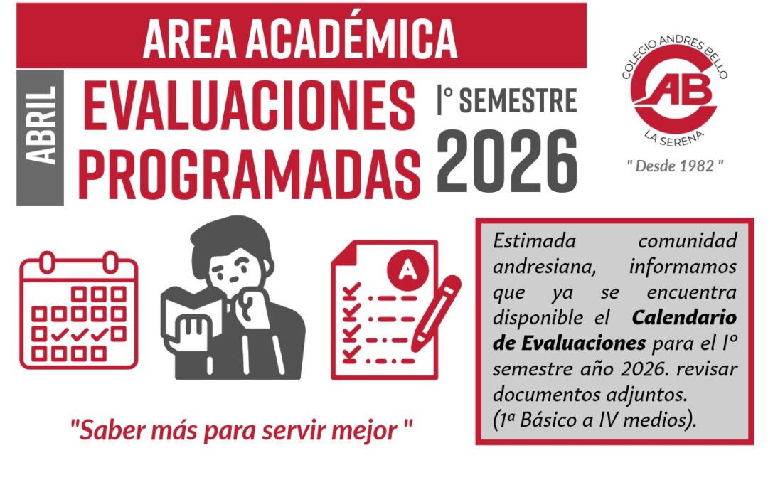 Estimada comunidad andresiana: Junto con saludarlos se adjunta calendario de evaluaciones: periodo I semestre año 2026 (1° Básico a IV medios).