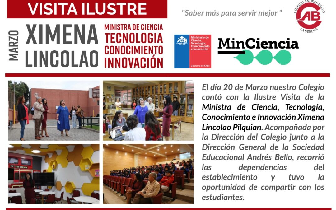 El viernes 20 de marzo, la Ministra de Ciencias, Tecnología, Conocimiento e Innovación, Ximena Lincolao Pilquian, visitó el Colegio Andrés Bello como parte de su primera gira regional. Fue recibida por las autoridades de la institución, el Director General de la Sociedad Educacional Hugo Araya Marín y la Directora del Colegio Ivonne Galleguillos Evans.